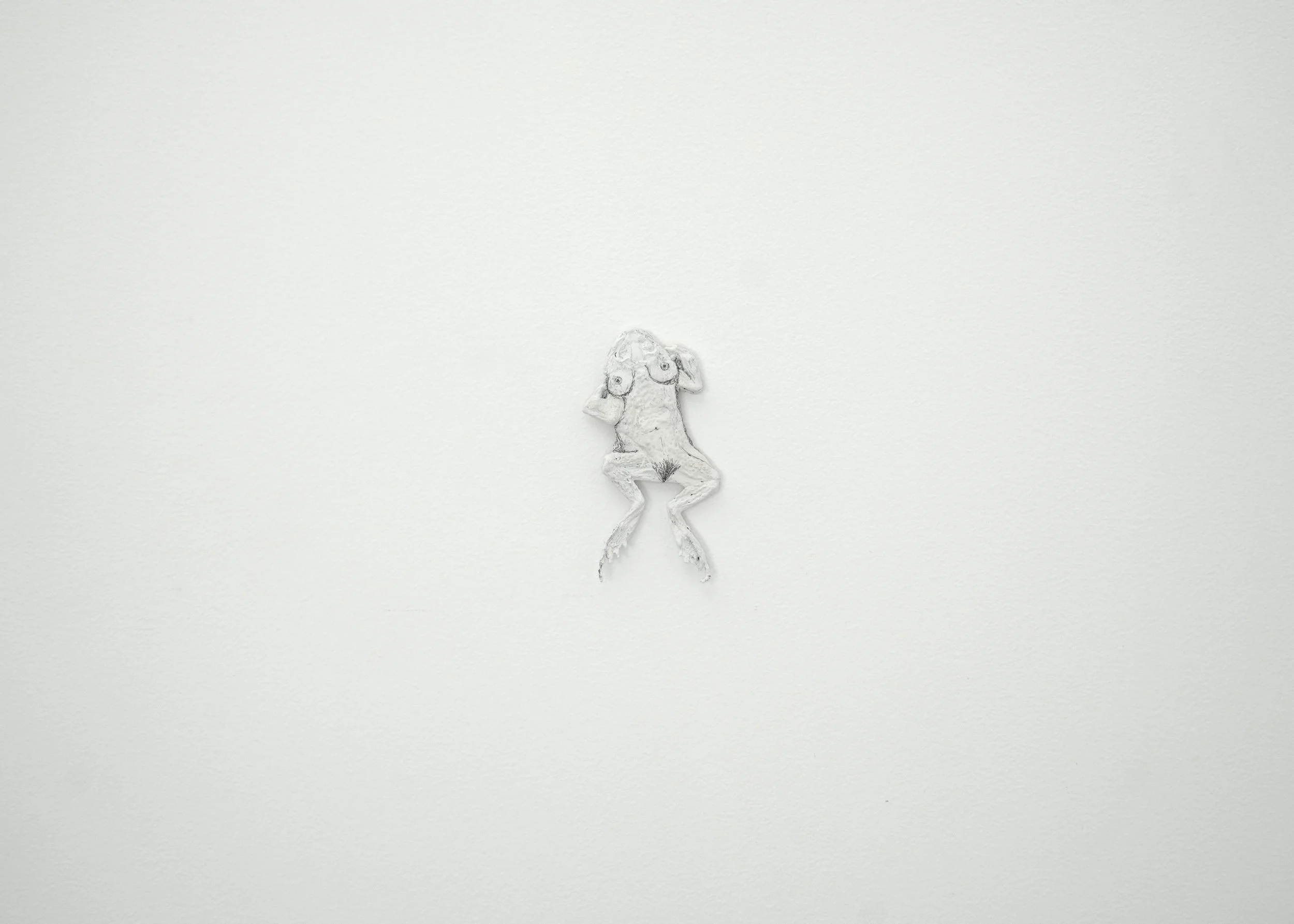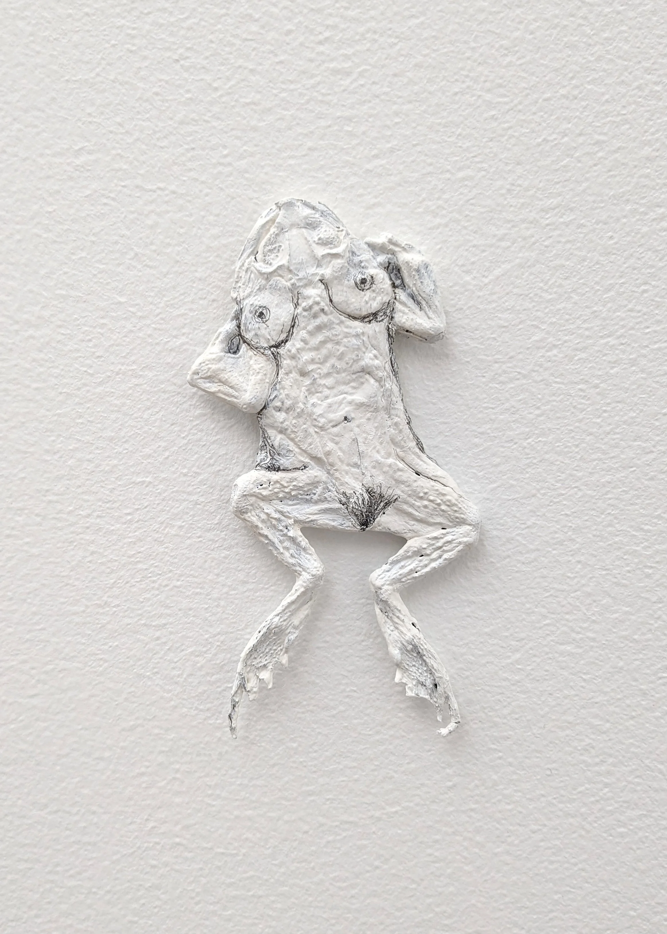 Being (Chelsea), graphite and gesso on found crushed frogbody, 2024